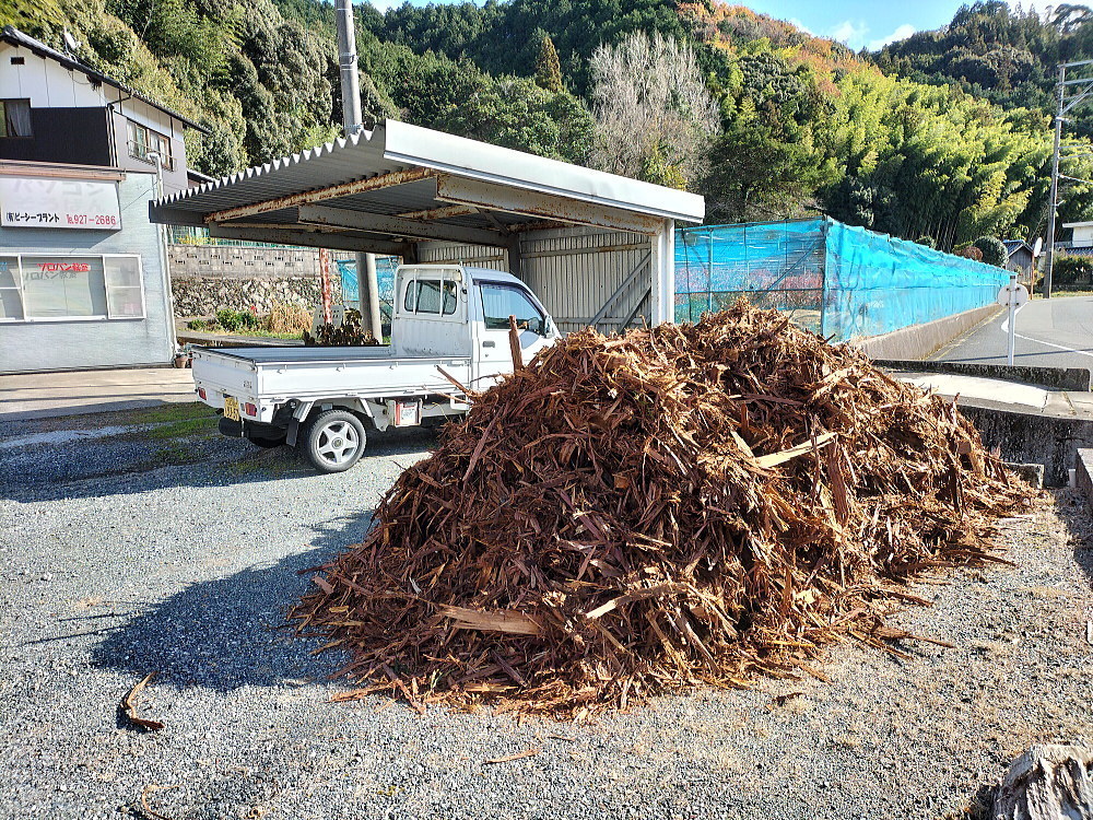 講座から帰ってみると、駐車場に頼んでいたブルーベリーの根元に配布する杉皮が2t届いた。。