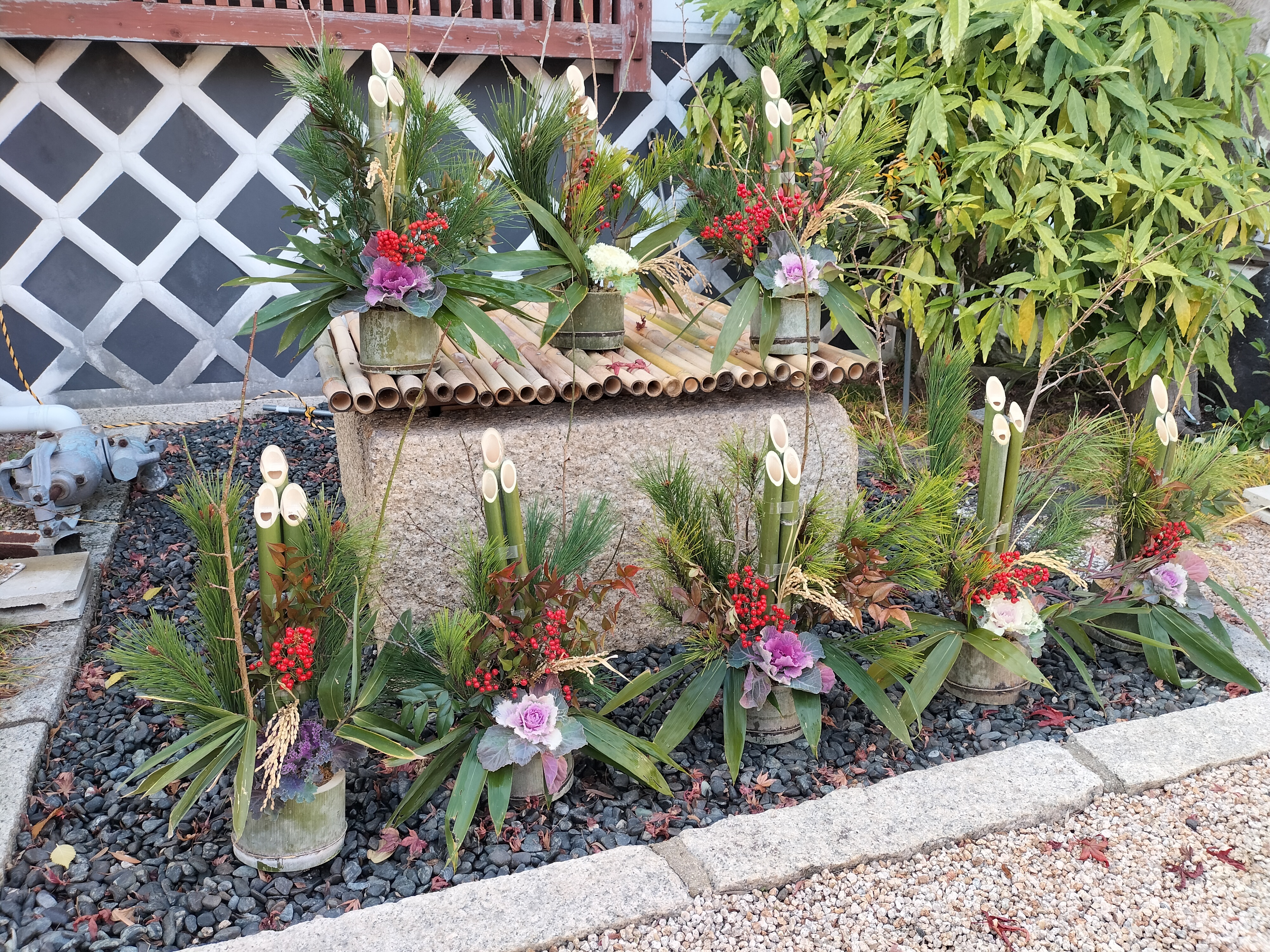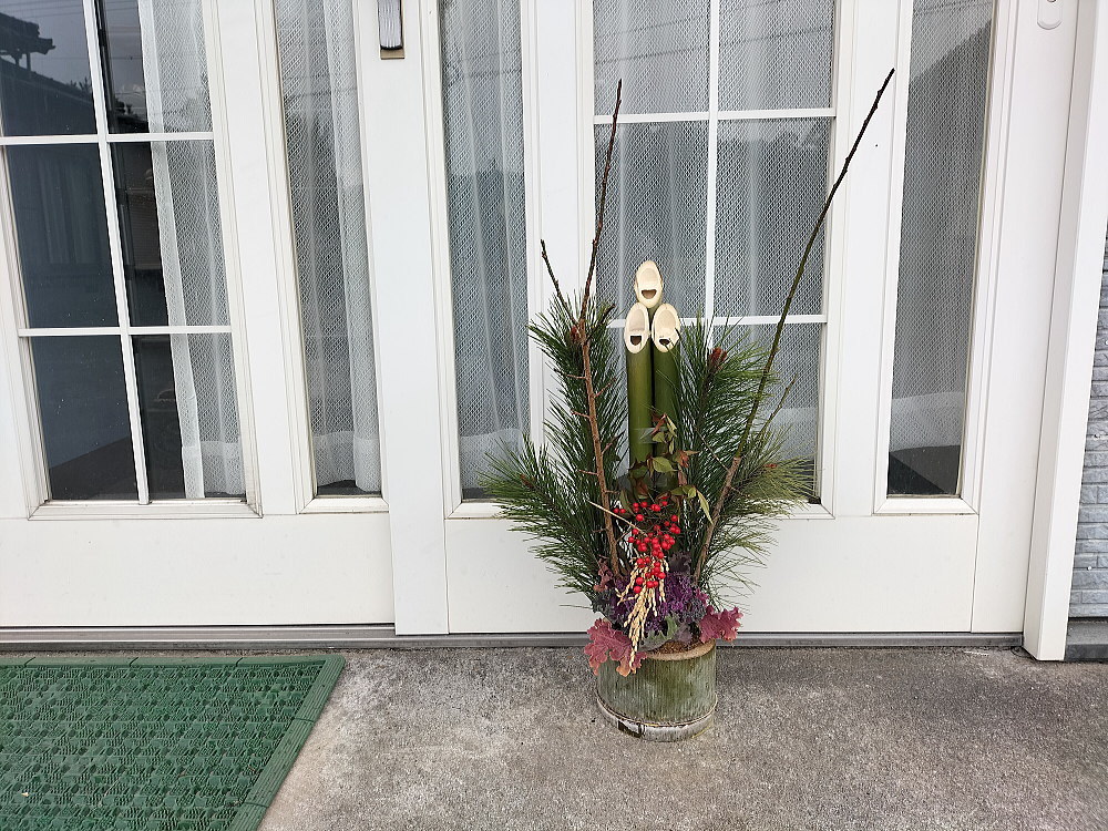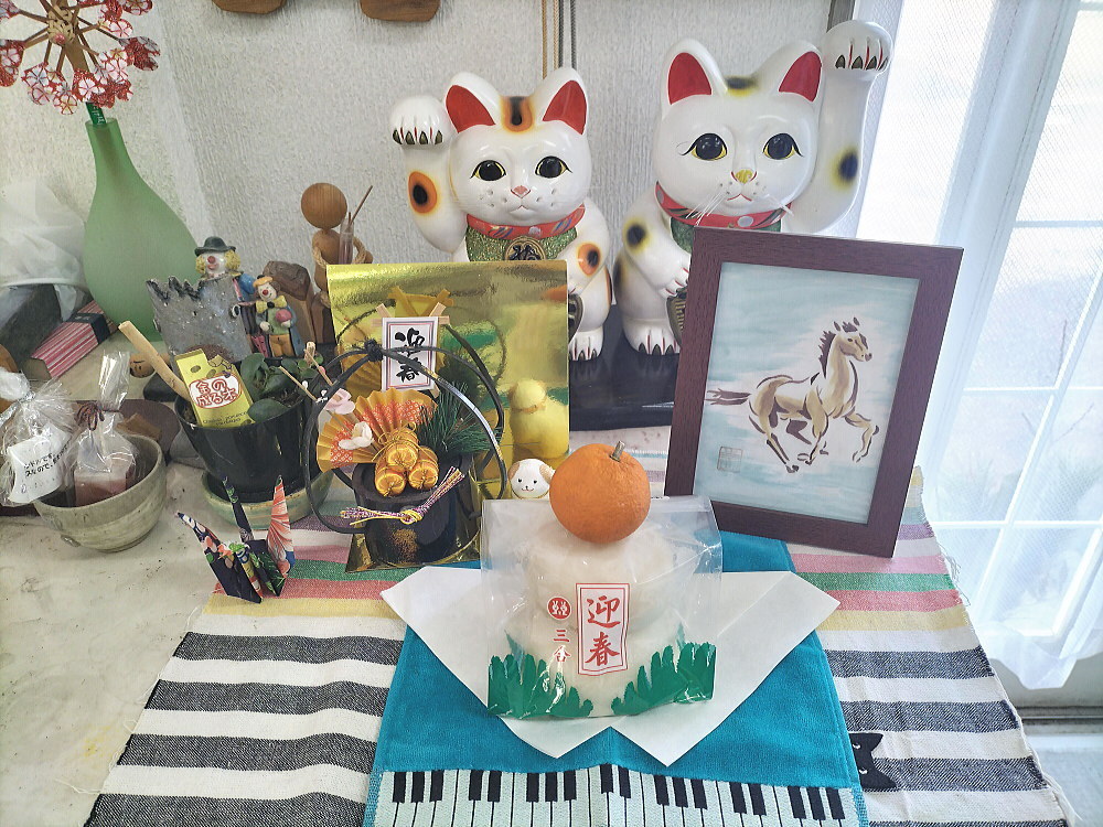 朝から母屋と教室の玄関に和飾りを取り付けて、母屋の床の間と教室に鏡餅をセット。。
